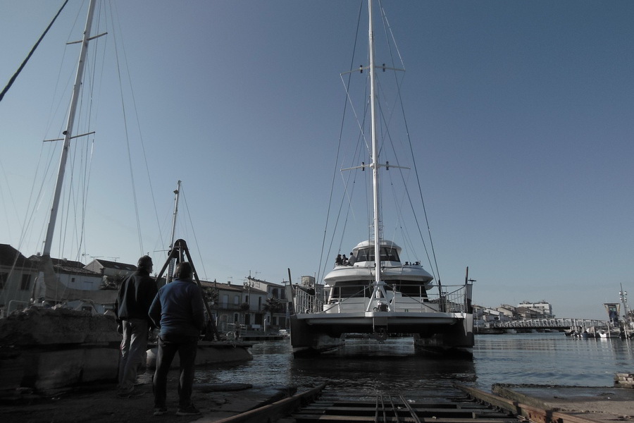 Mise à terre d'un Catamaran d'une longueur de 21 m et d'une largeur de 9 m au chantier.