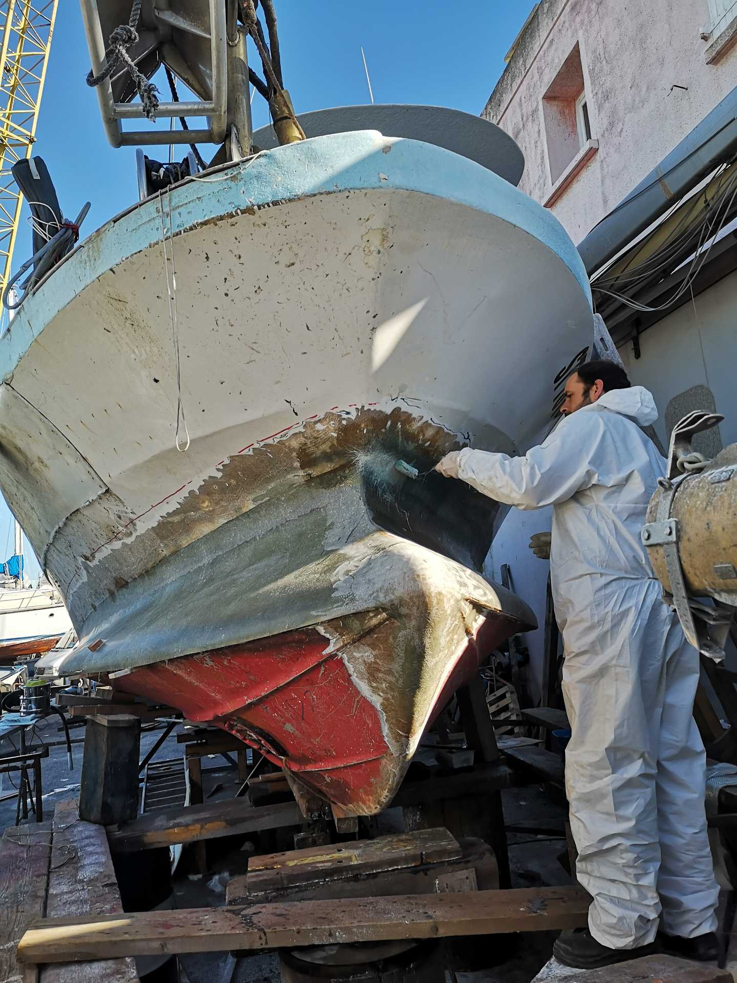 Rénovation d'une vedette de pêche à l'origine construite par le chantier naval Allemand situé au Grau d'Agde. Les photos montrent les différentes étapes avec la découpe de la coque, puis la fabrication d'un bulbe d'étrave. Les membrures en bois ont été faites sur mesure à lintérieur, puis doublées en polyester à 7 toiles Mat et Roving. La coque avant a été avancée d'un mètre pour faire le bulbe qui a été moulé, collé et soudé au polyester. Indépendamment, une casquette de cabine a égaiement été faite lors de ce chantier. Une réussite totale, la vedette a énormément gagnée en vitesse et stabilité.